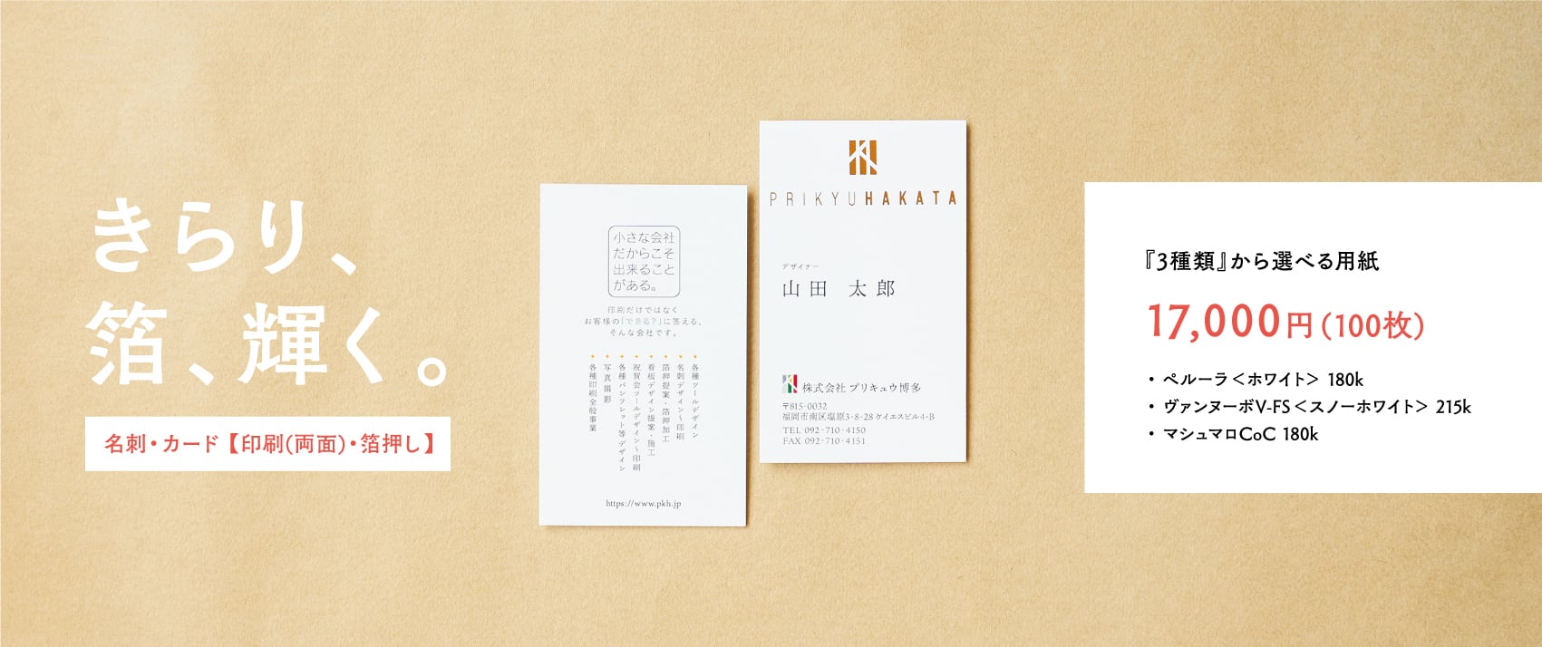 『 洗練された箔押し名刺・カードで印象を残す。』 名刺やカードは、あなたの想いや個性を伝える大切なツールです。 従来のデザインに華やかさをプラスし、相手の印象に残るツールを作ってみませんか? ■ 一般的な名刺サイズ55×91mm (角)です。 箔の色は「金・銀・マット金(錆金)・マット銀(錆銀)」からお選びいただけます。 箔押し箇所は、1箇所(1版)のみです。 ■ 入稿形式は「Illustrator(ai) または PDF」のみとなっております。 91×55mmに対して、余白を天地左右にそれぞれ3mmずつ足し(塗り足し)、97×61mm データとしてください。 ・aiの場合:アウトライン後、バージョンを「Illustrator CS6」以下にてお願いいたします。 仕上がり確認用の画像(PDFやjpeg等)・画像を配置している場合はそちらのデータも一緒に入稿くださいませ。 ・PDFの場合:「PDF/X-1a:2001(日本)」にてお願いいたします。 ■ 入稿先・記載事項 「[email protected]」へ、件名を必ず 「BASE名刺・カード【印刷(両面)・箔押し】入稿」としてお送りください。メール本文に、下記の項目を記載お願いいたします。 ・住所 (郵便番号) ・電話番号 ・会社名 ・氏名 ・その他気になられること 入稿データを確認しまして、3営業日以内に返信させていただきます。 また、ご購入から4日以内に入稿メール等いただけない場合、一旦キャンセルとさせていただきます。 ■ 注意事項 ・細かすぎる絵柄や文字は潰れる可能性があります。 ・ベタが多いと箔抜け(箔に小さな穴が開く)を起こす場合が有ります。 ・箔押しと印刷を組み合わせる際は、仕上がりにごく小さな位置のずれが起こる場合があります。位置精度に敏感なデザインは十分にご配慮ください。 ・オンデマンド印刷となります。画面で見る色と同じにはなりませんのでご了承願います。 ・直射日光や湿気の多い場所を避け、紙製品として長持ちさせるために、保管は平らな状態でお願いいたします。 ・箔押し部分には強い摩擦を避けるようご注意ください。 ・著作権、各種権利に関するご確認について、ご入稿いただくデザインにつきましては、著作権を含む第三者の権利を侵害していないかどうか、必ずお客様ご自身でご確認ください。万一権利侵害が発生した場合でも、当社ではその責任を負いかねますので、あらかじめご了承ください。 ・1回のご注文で100枚となります。金額は金型・用紙料金・送料込みです。 ・土日祝日はお休みとなるため休み明けの対応となります。 ■ 発送・返品について ・データ確認後、通常1週間程度で発送いたします。 ・作成しました金型も一緒にお渡しいたします。 ・発送はクリックポストにて、日本国内に限ります。 ・製品の性質上、返品・交換はお受けできませんのでご了承願います。 ■ その他ご質問などございましたら、ホームページよりお問い合わせ、またはお気軽にお電話くださいませ。BASEに掲載しております商品以外にも、様々な箔のカラーやサンプルがございます。是非ご覧ください。 https://www.pkh.jp